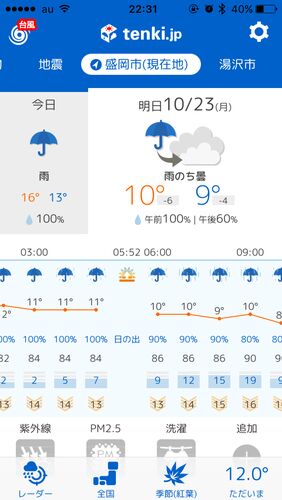 土曜日、台風の接近でどうも日曜から月曜あたりの天気が相当あやしい、ということで岩山を走っておいた 結果的には大正解。日曜の今日は雨の中投票所との往復3kmほどを軽くジョグしただけの実質ランオフ。明日も天気予報はこんな感じ これはあかんでしょ。雨…